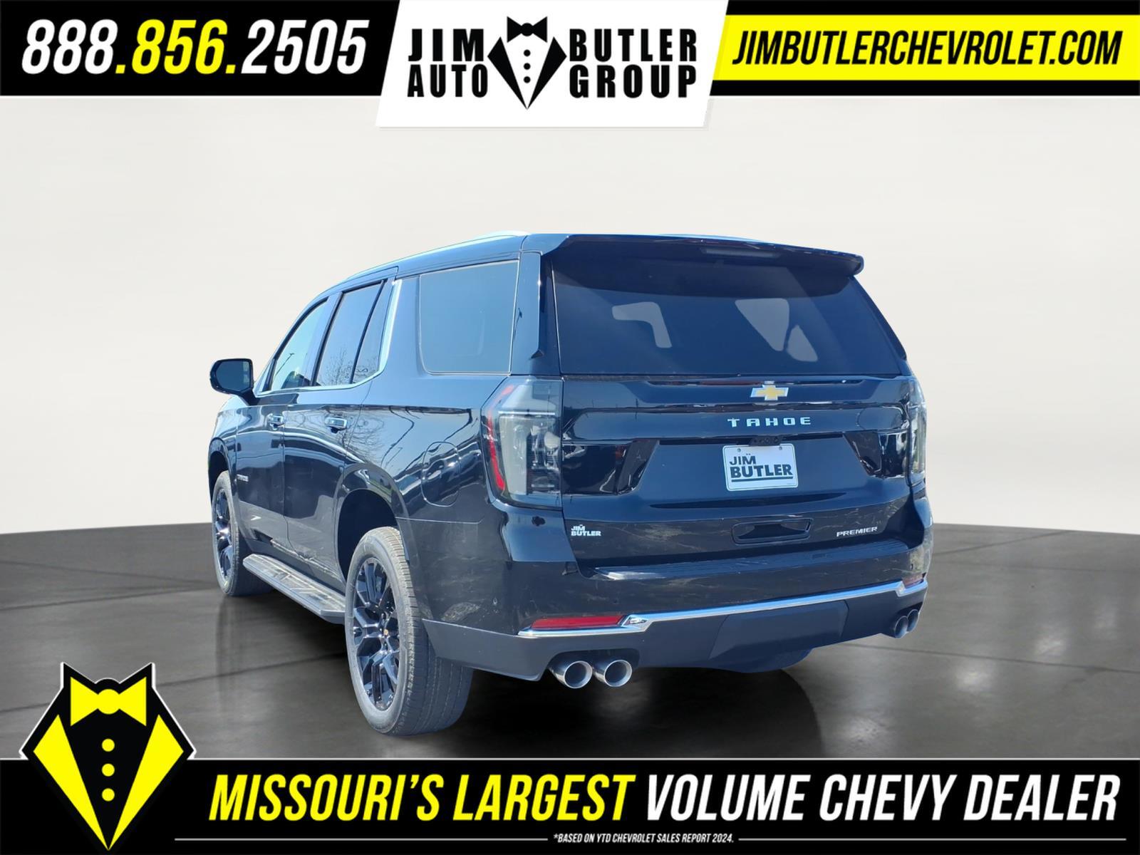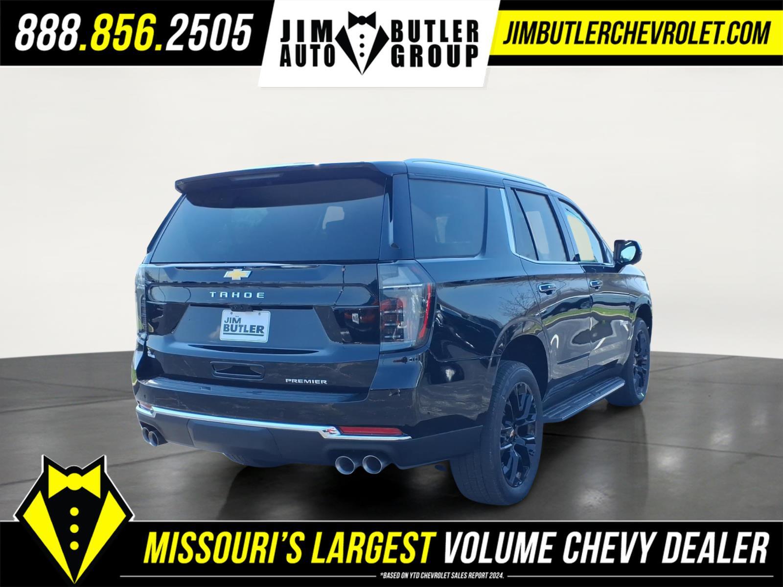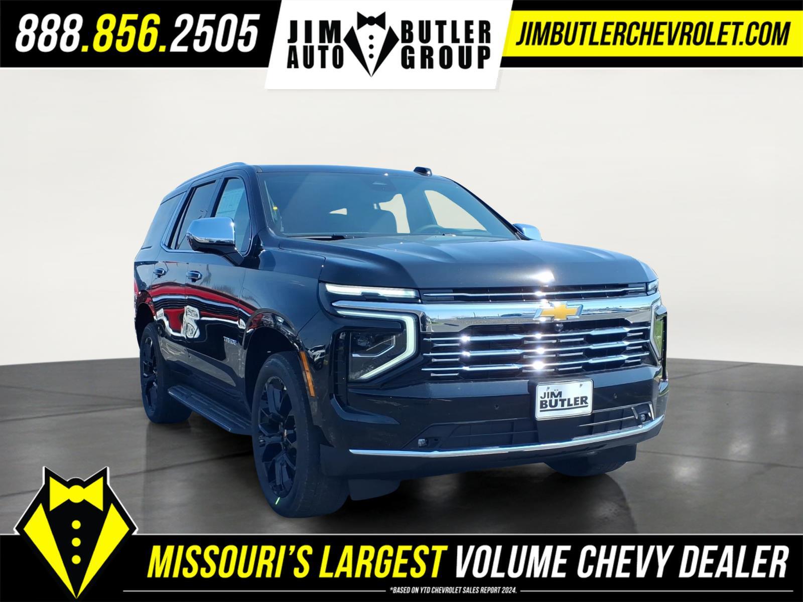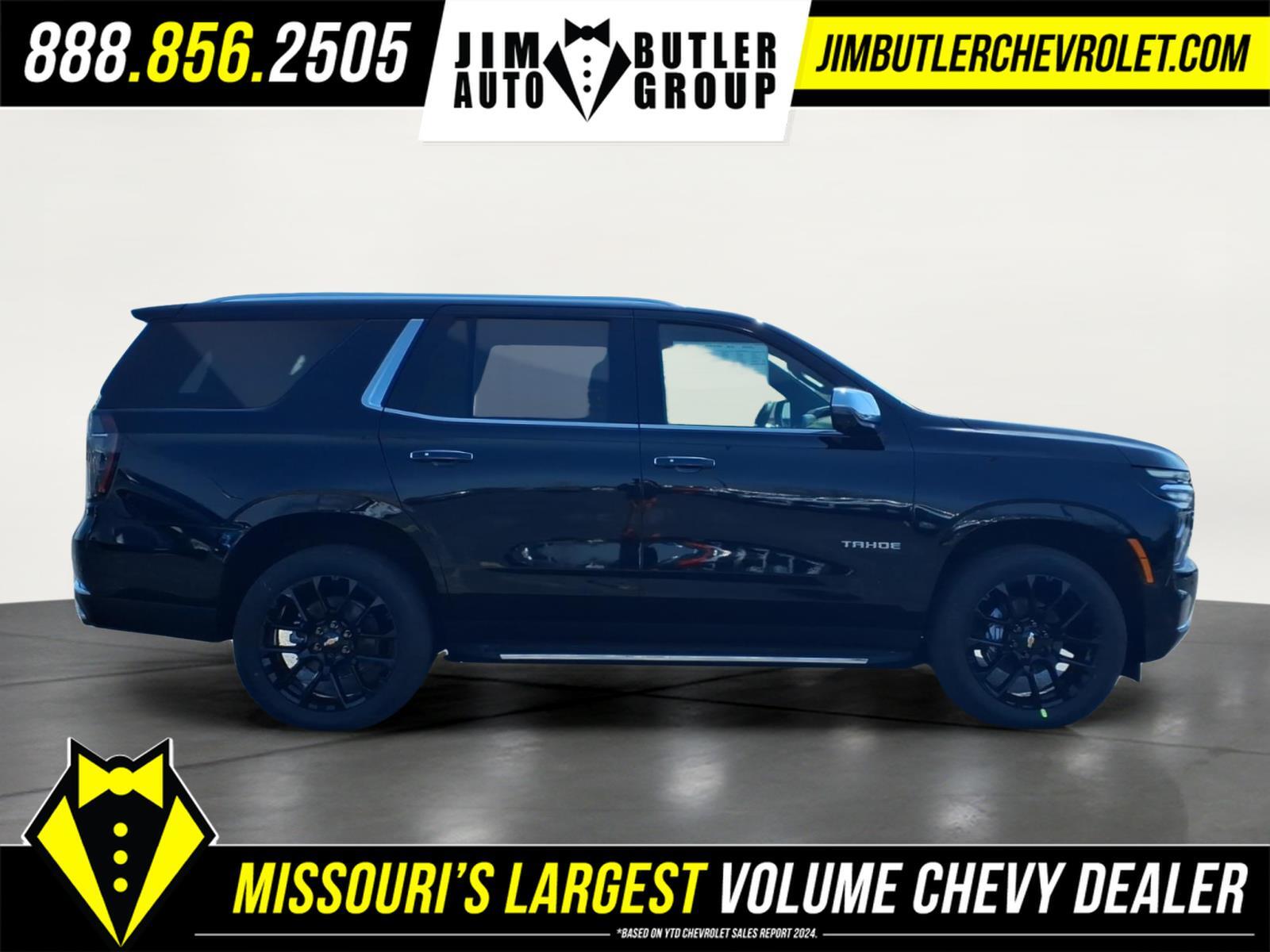 2026 Chevrolet Tahoe Premier Premier Black 4WD 10-Speed Automatic with Overdrive EcoTec3 5.3L V8 Please call today (888) 475-3191. We are proud to be a GM Mark of Excellence Dealership. Come see why we are the #1 Chevrolet dealership in the Midwest. On top of that we have also been awarded Dealer of the year the last 11 years. Proudly serving: St. Louis, South County, Webster Groves, Creve Coeur, Kirkwood, Maryland Heights, Sullivan, Rolla, Columbia, Fenton, Chesterfield, St. Charles, Kansas City, Springfield, Jefferson City, and all of great Missouri and Illinois. While we make every attempt to ensure pricing accuracy. Dealer not responsible for computer or human error, dealer reserves the right to change prices due to human or computer error. In order to put a 24 hour hold deposit on vehicles, Financing must be secured thru Jim Butler Chevrolet Business Office and Cash Deals must be Electronically Transferred within Six Hours. Advanced Security Package (Glass Breakage Sensor, Theft-Deterrent Alarm System, Vehicle Inclination Sensor, and Vehicle Interior Movement Sensor), Advanced Trailering Package (Blind Zone Steering Assist with Trailering, Hitch View with Pan/Zoom Image Adjustment, and Smart Trailer Integration Indicator), License Plate Front Mounting Package, Max Trailering Package (2-Speed Active Electronic AutoTrac Transfer Case, Hill Descent Control, and Integrated Trailer Brake Controller), Preferred Equipment Group 1LZ (1st and 2nd Row Color-Keyed Carpeted Floor Mats, 20x 9Polished Aluminum Wheels, 3-Spoke Wrapped Steering Wheel, 3rd Row 60/40 Power-Folding Split-Bench Seat, Auto-Dimming Inside Rear-View Mirror, Bose 10-Speaker Centerpoint Surround Audio System Feature, Bright Front and Rear Door Sill Plates, Chrome Door Handles with Body-Color Strip, Chrome Mirror Caps, Color-Keyed Carpeting Floor Covering, Dual Exhaust System, Floor Console, Front Bucket Seats, Front LED Fog Lamps, Frontal Driver and Outboard Passenger Airbags, Heated 2nd Row Outboard Seats, Heated Steering Wheel, Interior Camera, Key Card, LED Headlamps with LED Daytime Running Lamps, LED Tail Lamps, Magnetic Ride Control Suspension, Memory Settings, Outside Heated Power-Adjustable Mirrors, Power Release 2nd Row Bucket Seats, Power Tilt and Telescopic Steering Column, Rear Power Liftgate, Remote Start, SiriusXM with 360L Trial Subscription, Universal Home Remote, and Wireless Phone Charging), Technology & Entertainment Package (Dual-Pane Power Panoramic Sunroof and Rear