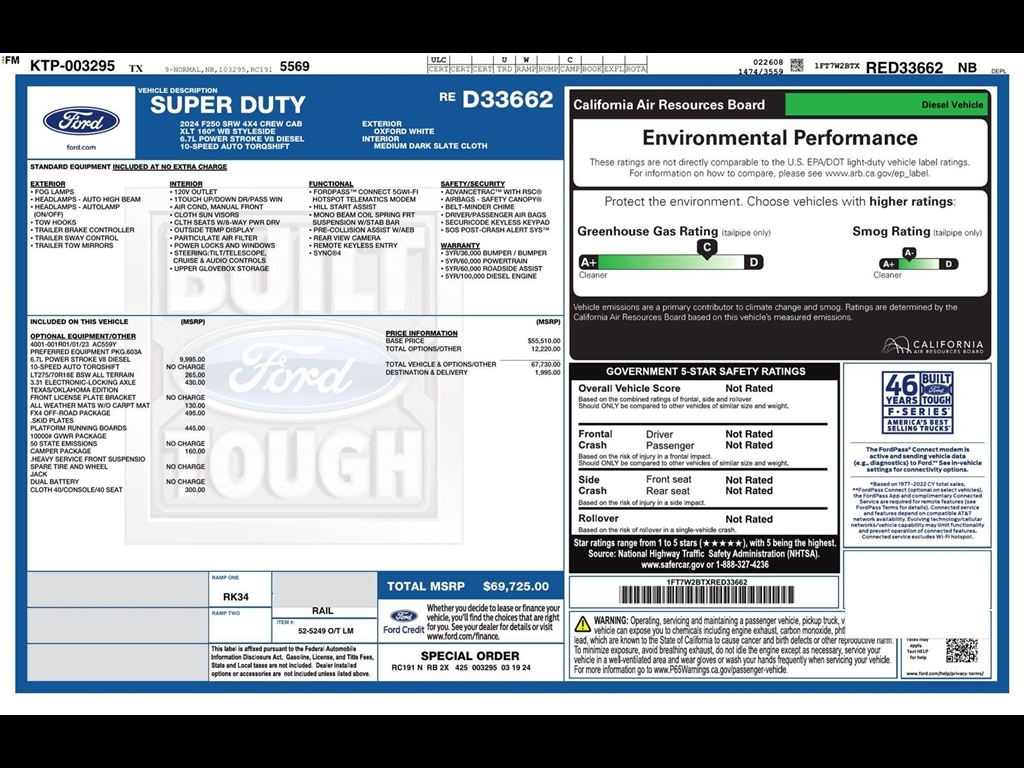 SUMMARY Clean Carfax! One Owner! **WARRANTY REMAINING: 22 MONTHS OR 9,403 MILES**, **6.7L POWER STROKE V8 DIESEL** ($9,995 ADD TO MSRP), PREFERRED EQUIPMENT PKG.603A, FX4 OFF-ROAD PACKAGE, CAMPER PACKAGE, 6.7L V8, 10-SPEED AUTO TORQSHIFT, 4WD, ALL TERRAIN TIRES, KEYLESS ENTRY, PUSH BUTTON START, REMOTE START, POWER DRIVERS SEAT, SYNC 4, FORDPASST CONNECT 5GWI-FI, HOTSPOT TELEMATICS MODEM, REAR VIEW CAMERA, RUNNING BOARDS, TOW HOOKS, HILL START ASSIST, PRE-COLLISION ASSIST W/AEB, SOS POST-CRASH ALERT SYSTEM EQUIPMENT Safety and Security The vehicle is equipped with a system that senses, and then prepares, the vehicle and/or occupants, for an impending forward collision. The vehicle is equipped with a system that senses, and then prepares, the vehicle and/or occupants, for an impending forward collision. With this system the drivers hands must remain on the wheel at all times but can be removed briefly (for a few seconds), otherwise the vehicle will prompt the driver to put their hands back on the wheel. The vehicle is equipped with a camera that displays an image of the area behind the vehicle on an interior display.Technology and Telematics Mobile devices can wirelessly connect to the internet through the vehicles private mobile network. PACKAGES FX4 Off-Road Package ($495 value)Unique FX4 Off-Road Box DecalHill Descent ControlOff-Road Specifically Tuned Shock AbsorbersTransfer Case and Fuel Tank Skid PlatesCamper Package ($160 value)Rear Stabilizer Bar and Auxiliary SpringsOrder Code 603A